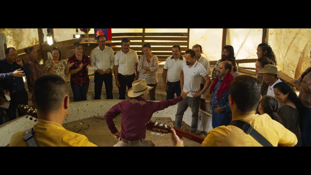 Los personajes encarnan posturas familiares: Sandro parece ser el candidato con propuestas y buenas intenciones, mientras Camilo representa al carismático sin plan claro. «Un candidato sin propuesta, sin diálogo», que gana apoyo a pesar de no tener ideas, mientras Sandro intenta argumentar racionalmente pero «no es escuchado». El resultado es una comedia que hace reír pero también incomoda. En los silencios entre canción y canción se escucha la fragilidad de la democracia, mientras la gente real del pueblo —no actores profesionales— deciden su destino.